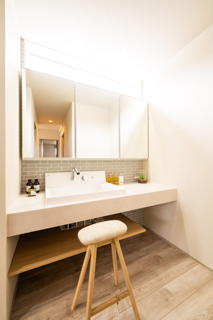 今回のお家は、勾配天井のある1.5階建てのお住まいで、ベージュを基調とした優しい色味のコーディネートがご来場された皆さまから特に好評でした!